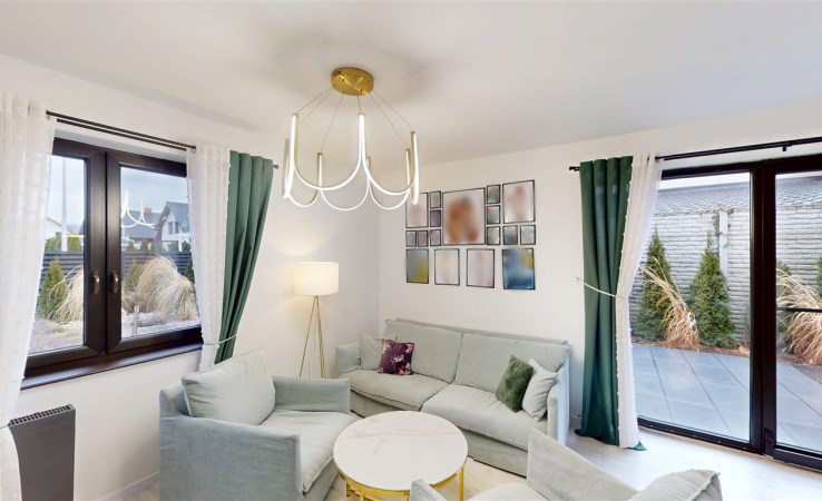 - SALON Z JADALNIĄ I KUCHNIĄ - serce strefy dziennej. Otwarta przestrzeń dobrze doświetlona, z możliwością wyjścia na taras. W salonie znajduje się kominek idealny na długie zimowe wieczory. Kuchnia w prawdzie otwarta, jednak usytuowana bocznie, co daje poczucie kontaktu jak i prywatności. Nowoczesna zabudowa kuchenna - doskonale wykorzystana przestrzeń dzięki meblom robionym na wymiar. Kuchnia w pełni wyposażona w dobrej jakości i sprawny sprzęt AGD