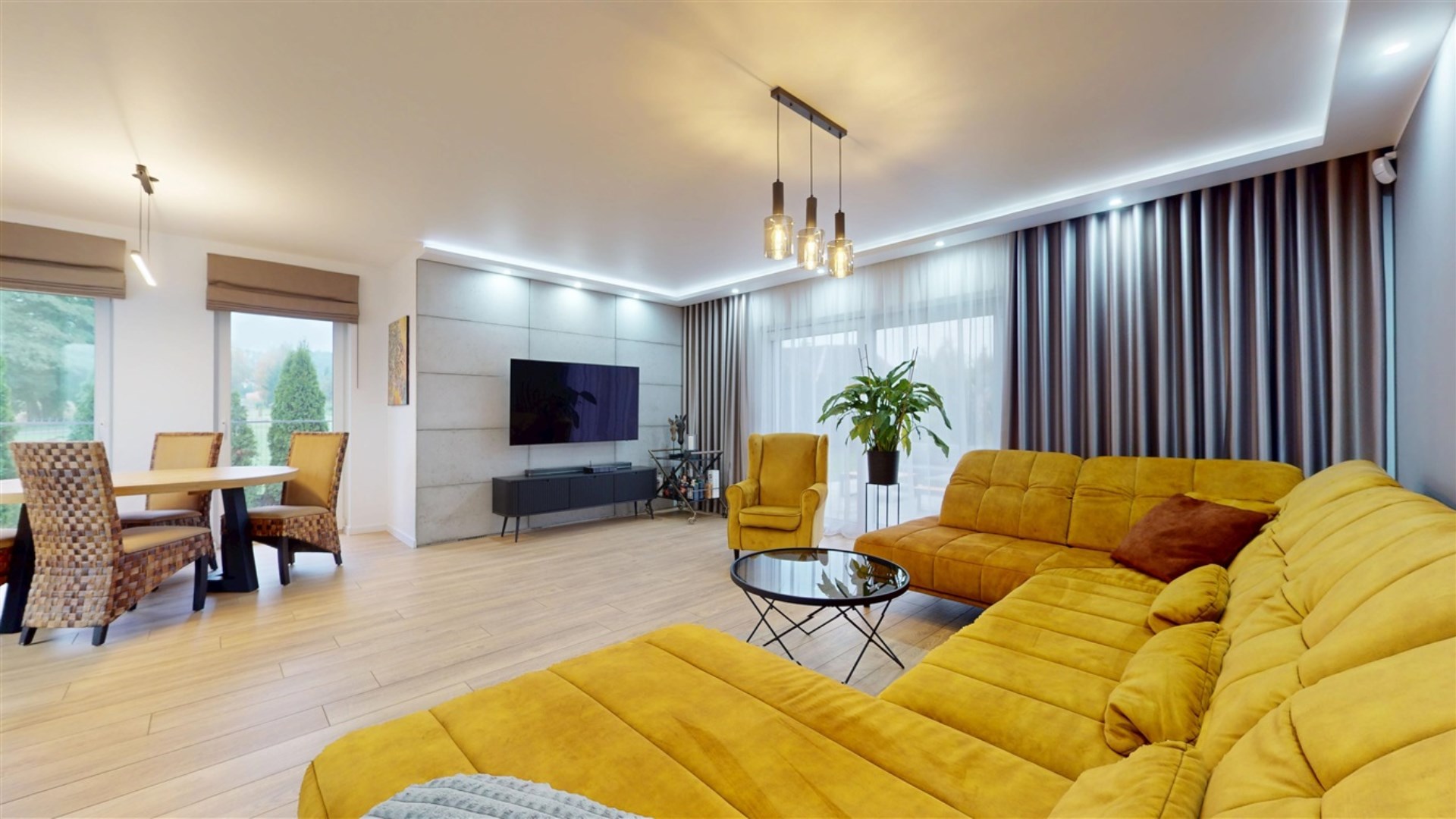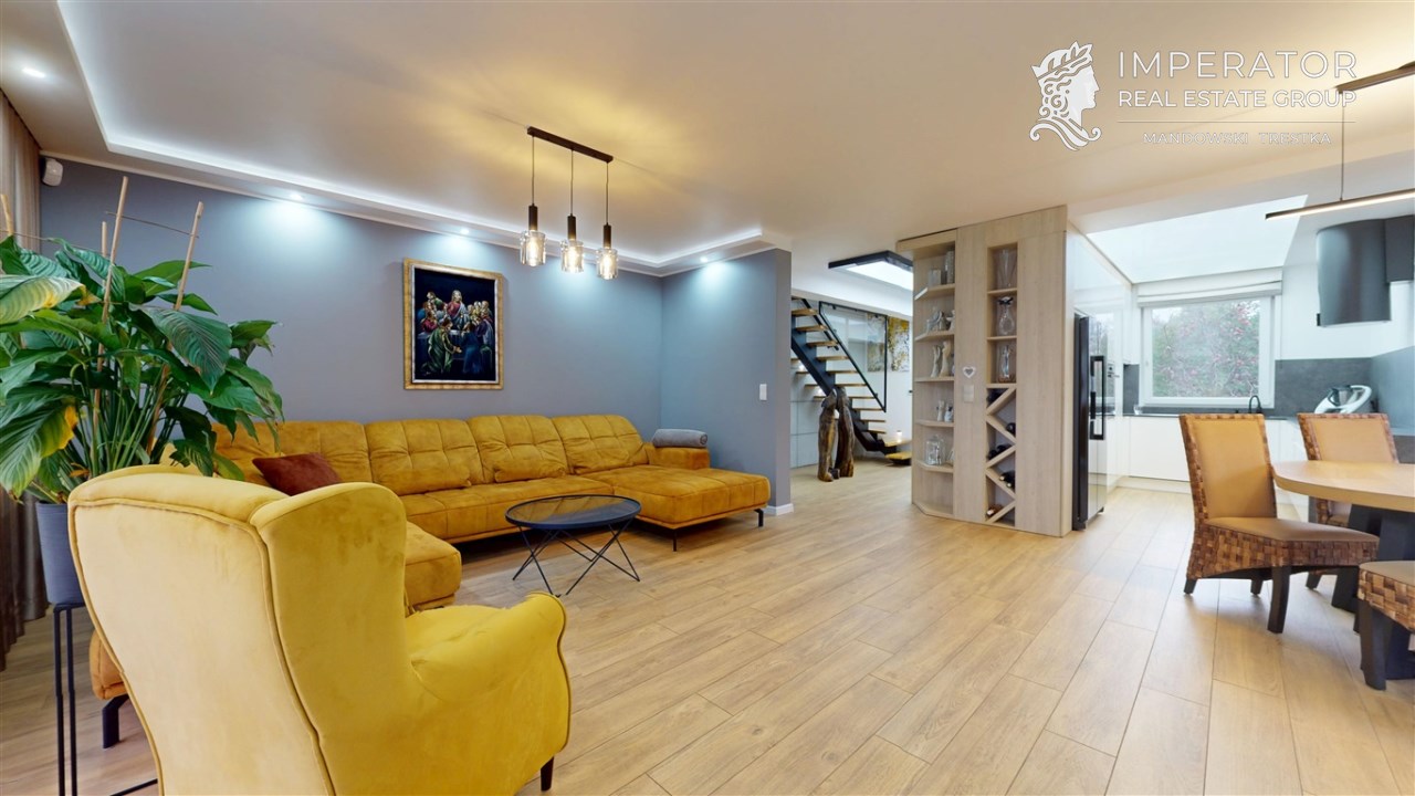 Prezentowana nieruchomość to parterowy dom o powierzchni całkowitej 276 m² usytuowany na posesji składającej się z działki o łącznej powierzchni 806 m². Dom został wykończony w wysokim standardzie, z dbałością o każdy szczegół. Wyposażony jest w meble wykonane na zamówienie.