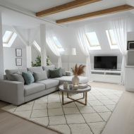 Zdjęcia salonu, pokoju i aneksu kuchennego przedstawiają możliwości aranżacji we własne meble i wyposażenie.