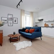 Zdjęcia salonu, pokoju i aneksu kuchennego przedstawiają możliwości aranżacji we własne meble i wyposażenie.
