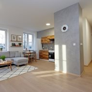 Zdjęcia salonu, pokoju i aneksu kuchennego przedstawiają możliwości aranżacji we własne meble i wyposażenie.