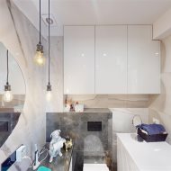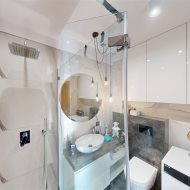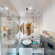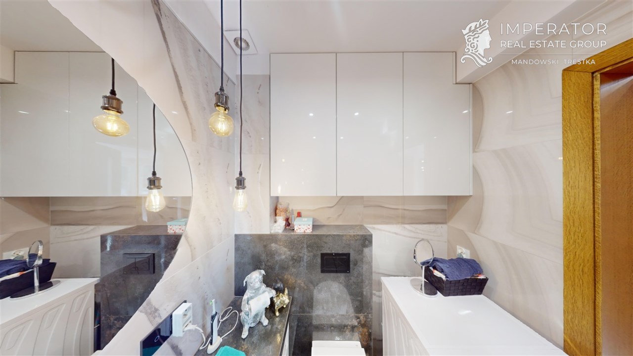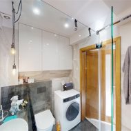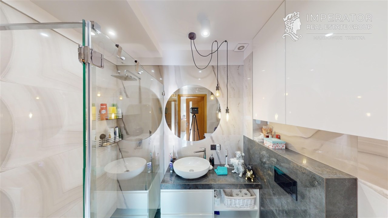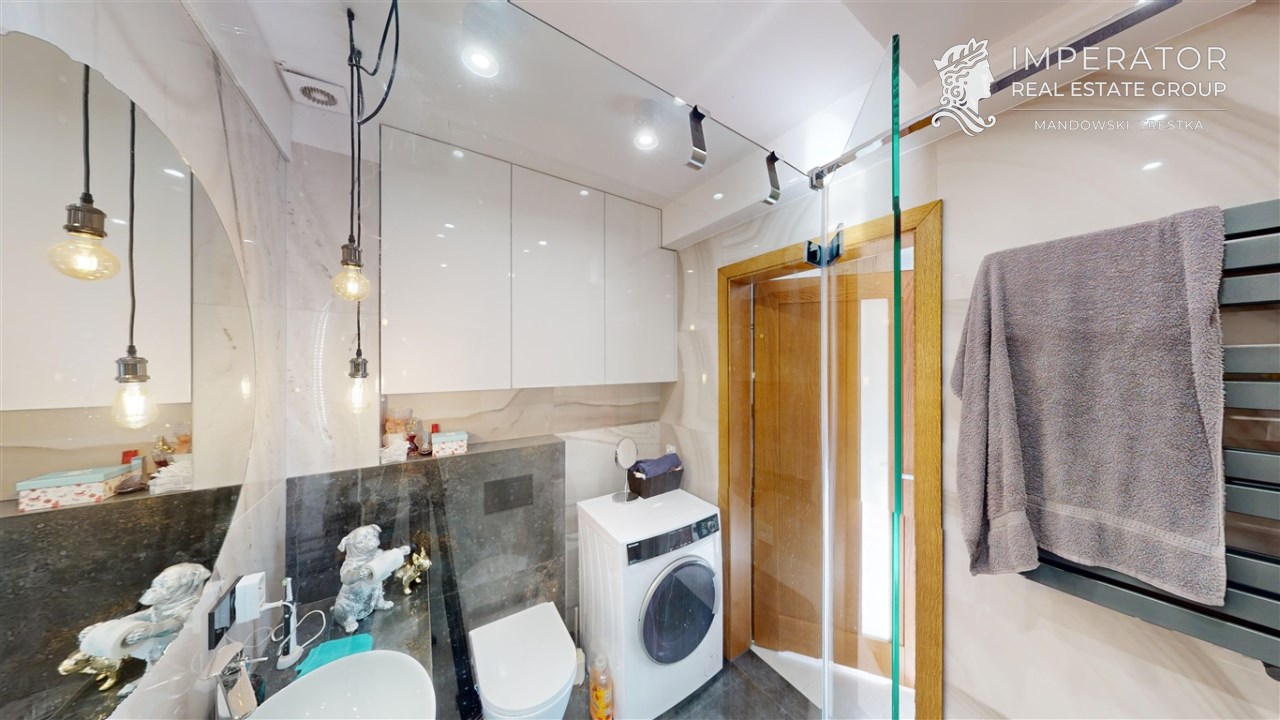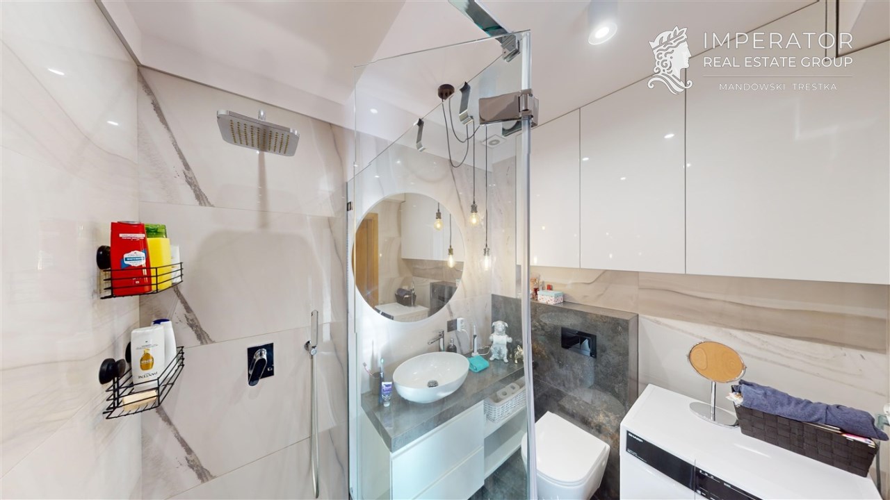 - łazienka z wc - wyposażona w prysznic walk-in z deszczownicą, umywalkę z szafką, pralkę, wc oraz dużo przestrzeni do przechowywania