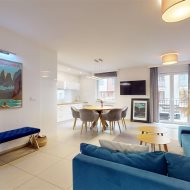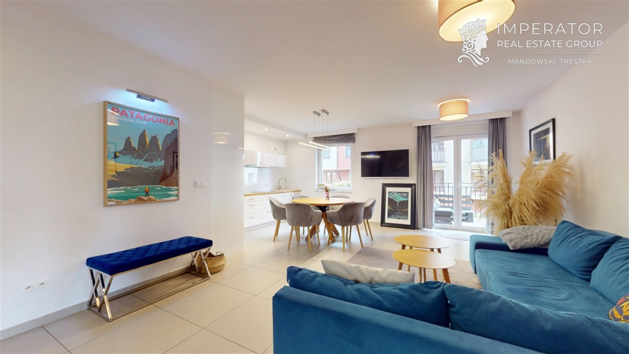 - Ogromny i komfortowy salon z kuchnią: miejsce wypoczynku, duża sofa narożnik, TV, balkon z wypoczynkiem ogrodowym