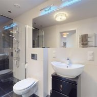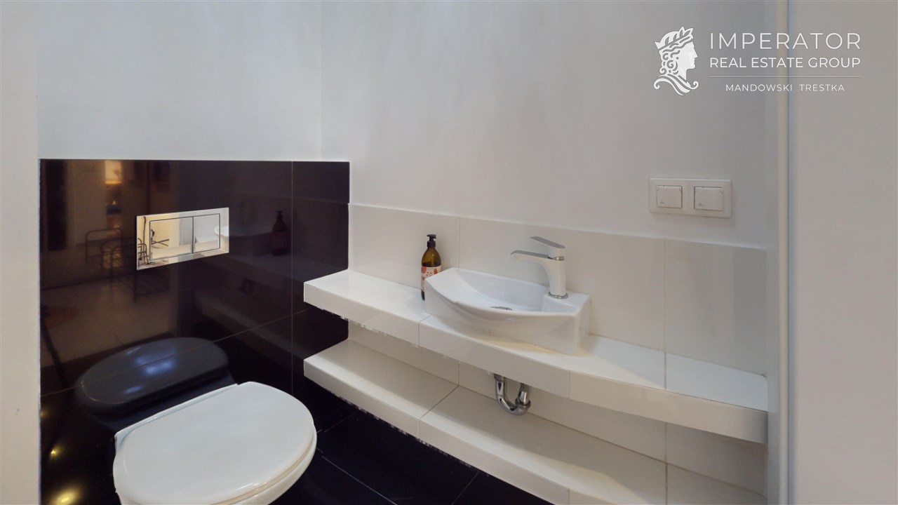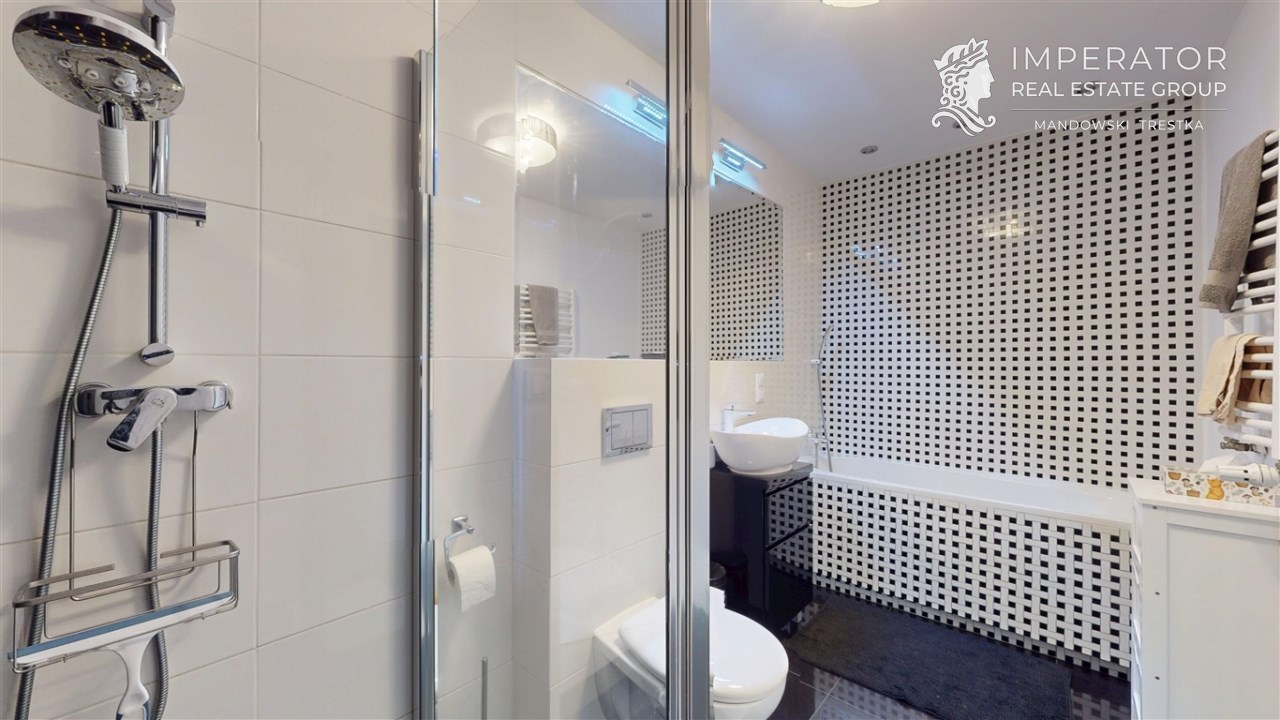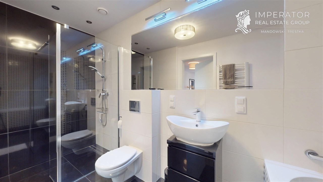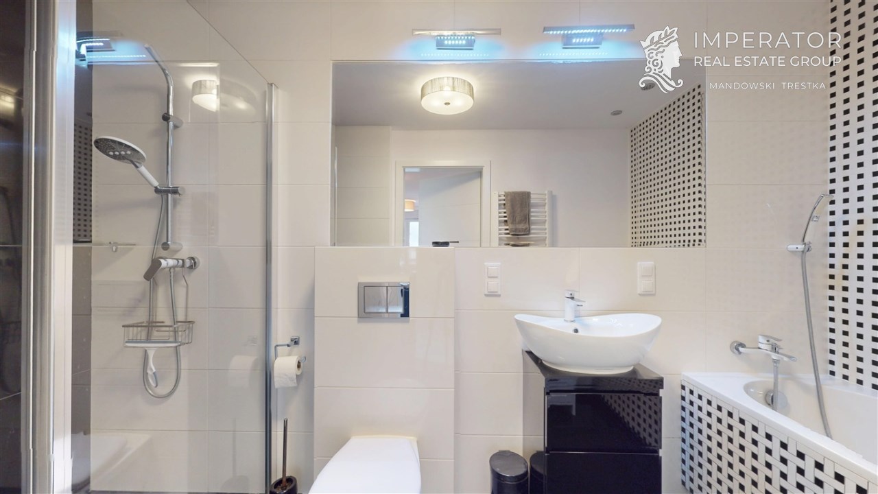 - Dwie łazienki: duży salon kąpielowy z wanną i z osobnym prysznicem, ponadto druga łazienka z WC